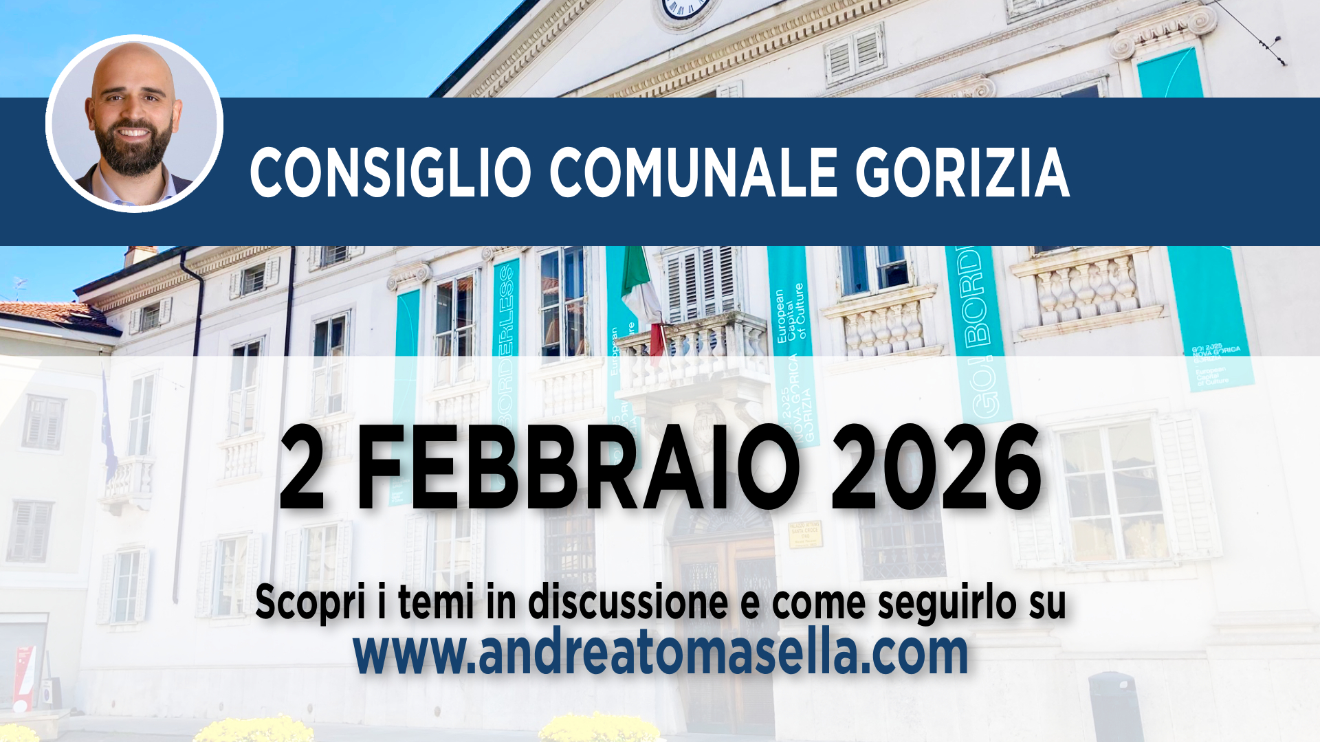 Il Consiglio comunale di Gorizia è stato convocato per la giornata di lunedì 2 febbraio 2026 alle ore 17.30, presso la Sala del Consiglio comunale del Comune di Gorizia.