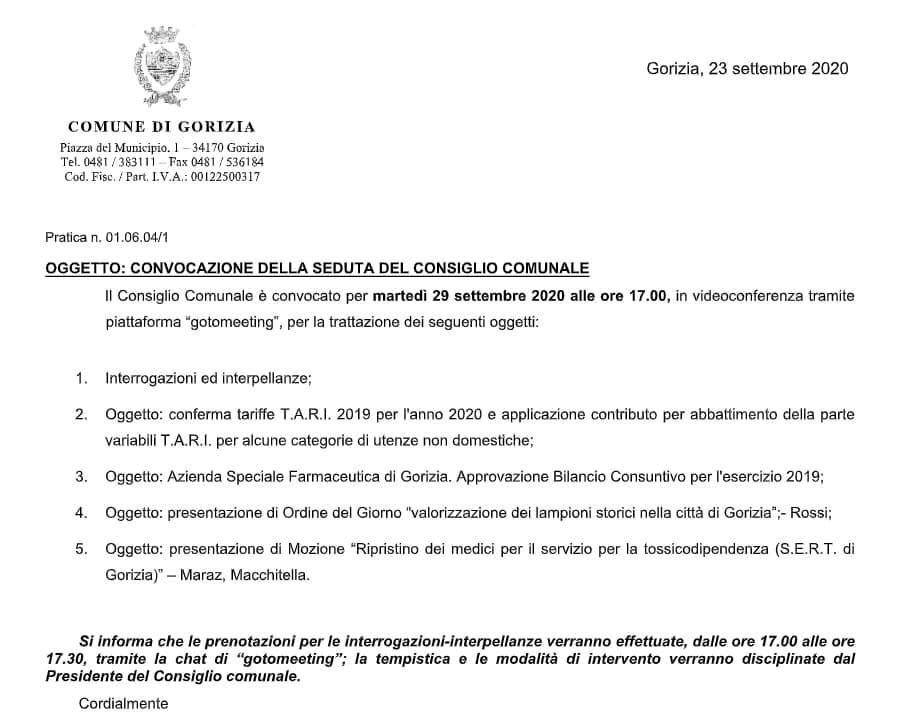 Oggi seduta del Consiglio comunale a Gorizia, di seguito trovate l’ordine del giorno.