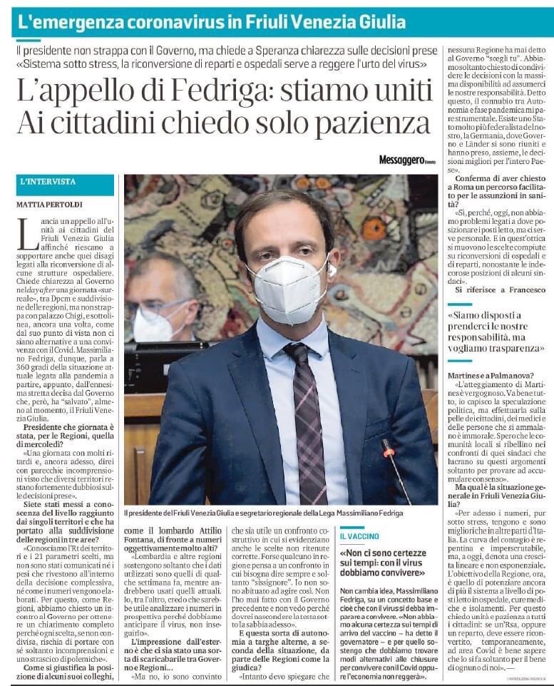 📰 Interessante intervista sul Messaggero Veneto al presidente Massimiliano Fedriga in relazione all’ultimo DPCM e alla situazione COVID-19 in Regione.