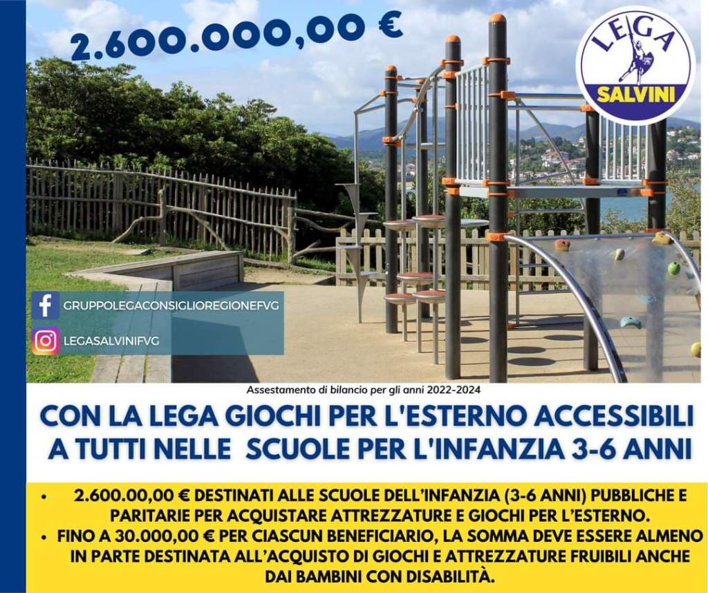 Si tratta di una misura molto importante, introdotta grazie alla Lega e dal valore di 2.600.000,00 euro per il 2022, volta a favorire il divertimento tra i più piccoli e ad implementare la sicurezza delle scuole dell’infanzia.
