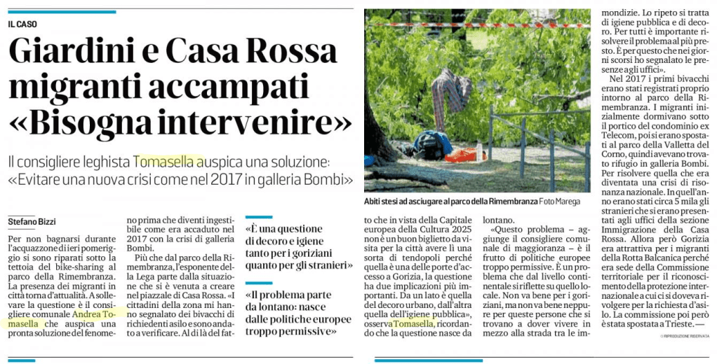 “Giardini e Casa Rossa migranti accampati. Tomasella (Lega): Bisogna intervenire” 27/07/2023