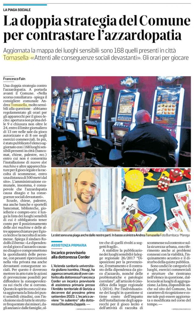 “Azzardopatia. Tomasella: Attenti alle conseguenze sociali devastanti” 25/08/2023