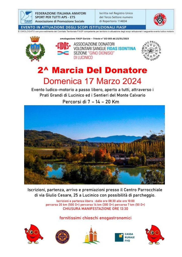 Dopo l’ottimo successo dello scorso anno, torna la Marcia del Donatore, evento ludico-motorio a passo libero organizzato dall’ADVS FIDAS Isontina “Gino Dionisio” di Lucinico per domenica 17 marzo.