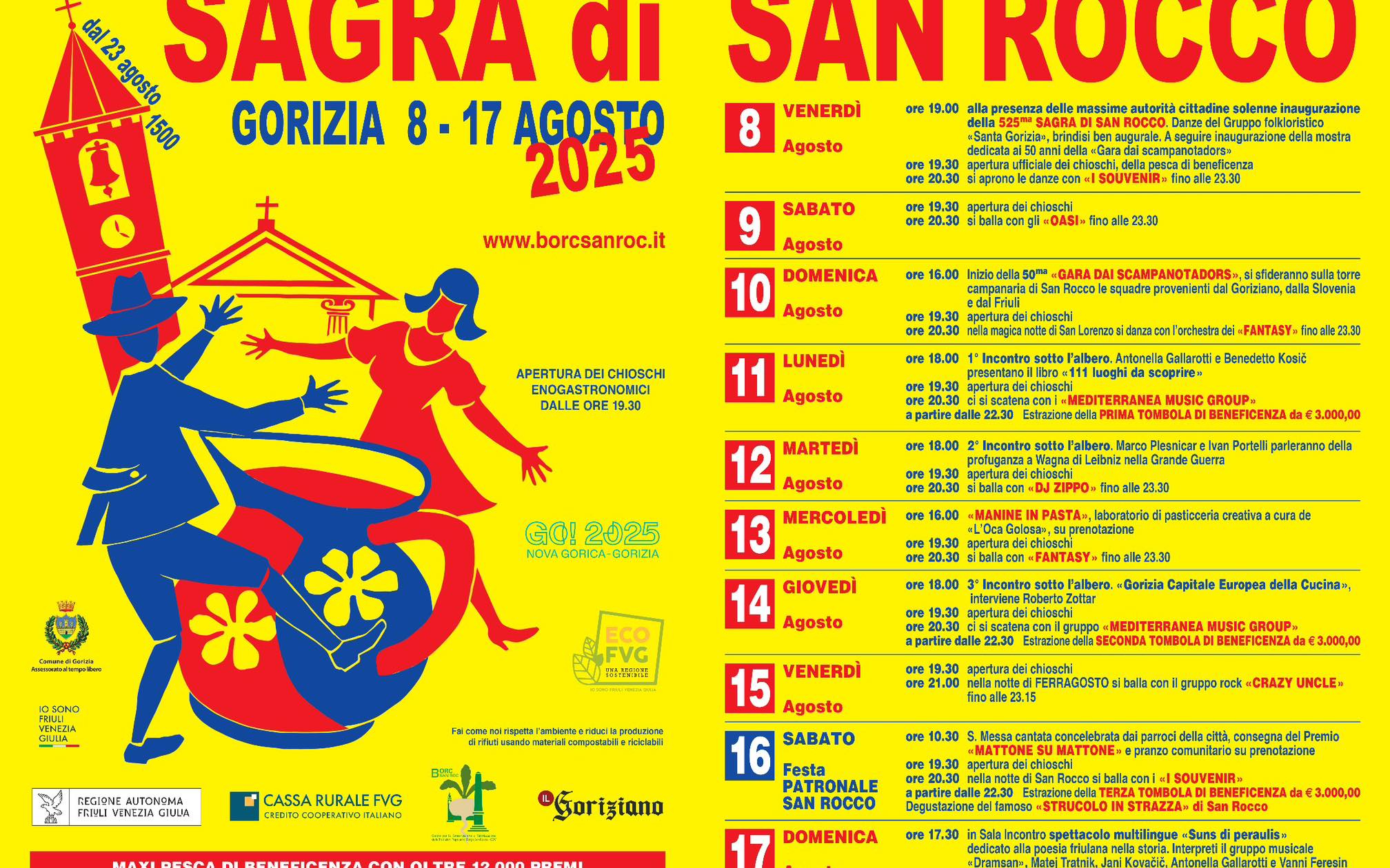 Sta per tornare uno degli appuntamenti più attesi dell’estate goriziana: la tradizionale Sagra di San Rocco, che quest’anno raggiunge la sua 525ª edizione e si svolgerà dall’8 al 17 agosto 2025