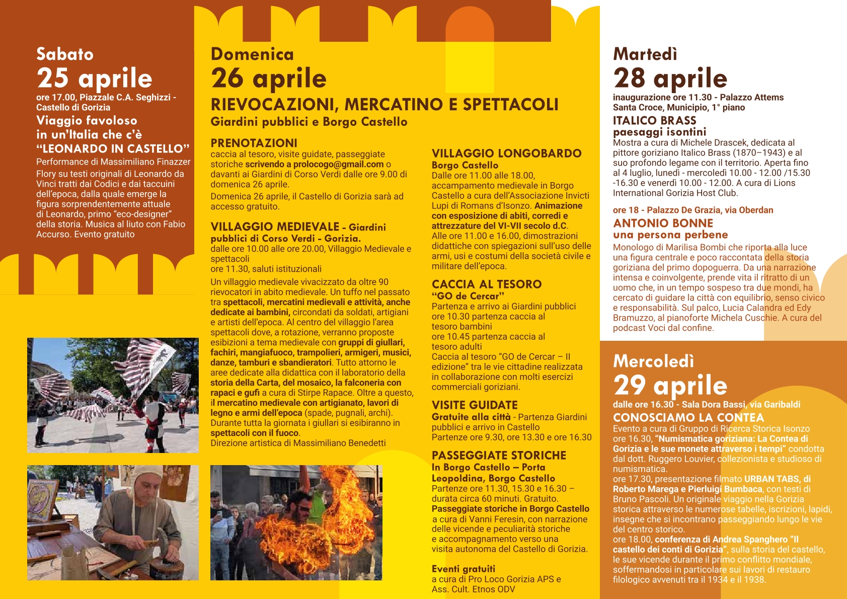 L’ultima giornata di mercoledì 29 aprile si svolgerà in Sala Dora Bassi a partire dalle 16:30. Il Gruppo di Ricerca Storica Isonzo curerà un pomeriggio di studi che si aprirà con l’intervento di Ruggero Louvier sulle monete della Contea di Gorizia attraverso i tempi. A seguire verrà presentato il filmato “Urban Tabs” di Roberto Marega e Pierluigi Bumbaca, con testi di Bruno Pascoli, che svelerà le storie nascoste dietro lapidi e insegne che incontriamo camminando per le vie del centro. La rassegna si concluderà alle 18:00 con la conferenza di Andrea Spanghero dedicata alla storia e ai restauri filologici del castello dei conti di Gorizia eseguiti negli anni Trenta, chiudendo idealmente il cerchio di questo lungo viaggio nel tempo.