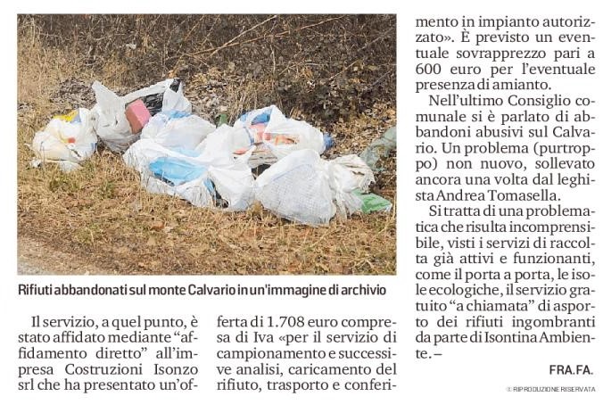 Oggetto: “Profonda preoccupazione per i continui e ripetuti abbandoni abusivi di rifiuti sul monte Calvario”