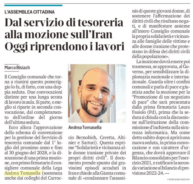 2. Mozione “Solidarietà e vicinanza alle donne iraniane private dei propri diritti civili” – primo firmatario cons. Tomasella;