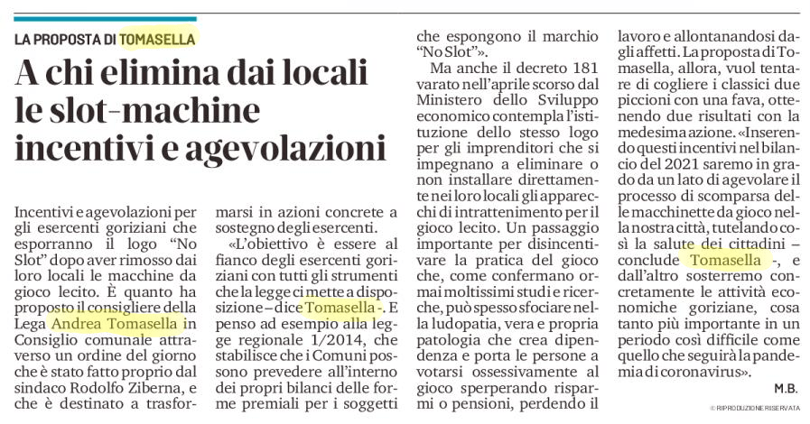 Oggi ancor di più, l’azzardopatia va contrastata: è proprio in questo contesto che si inserisce l‘ordine del giorno intitolato “Incentivi comunali per gli esercenti che espongono il logo NO-SLOT“, che ho presentato lo scorso 28 aprile e che è stato approvato dal Consiglio comunale.
