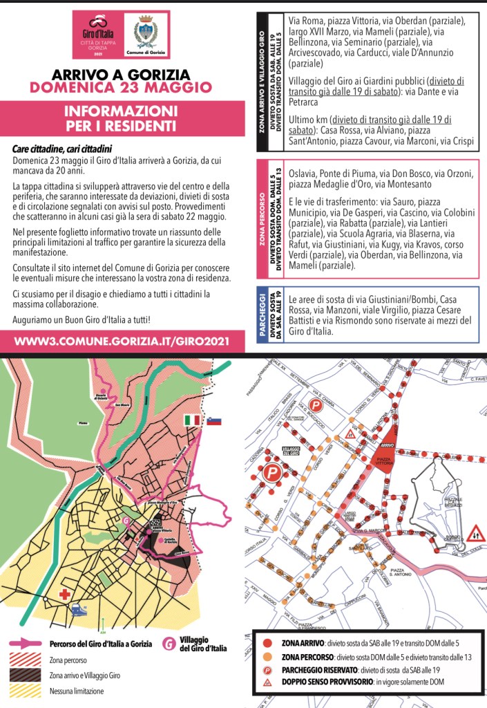 Nel dettaglio, il primo passaggio, previsto intorno alle 12:20, toccherà Località San Rocco di Lucinico, Via Antico Castello e Via Fonda, Via Tasso, Via delle Chiese Antiche, Via Sottomonte, Via delle Grappate, Via IV Novembre, Località Piedimonte, Via Ponte del Torrione, le Località Bella Veduta, Piuma, Ossario, Dosso del Bosniaco, Oslavia, Madonnina d’Oslavia, Lenzuolo Bianco e Tre Buchi.
