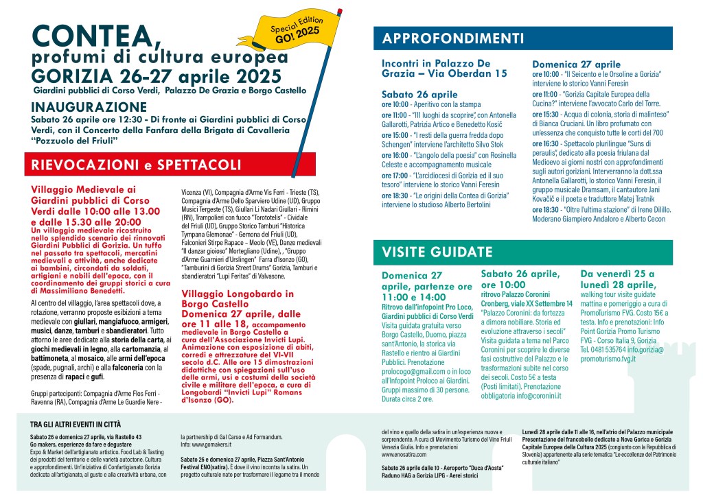Contea celebra la prima citazione ufficiale di Gorizia, comparsa in un documento del 28 aprile 1001 firmato dall’Imperatore Ottone III. L’edizione 2025 assume un significato speciale perché anticipa l’anno di GO! 2025 – Gorizia & Nova Gorica Capitale europea della Cultura, proponendosi come messaggero di pace e convivenza tra popoli di confine.