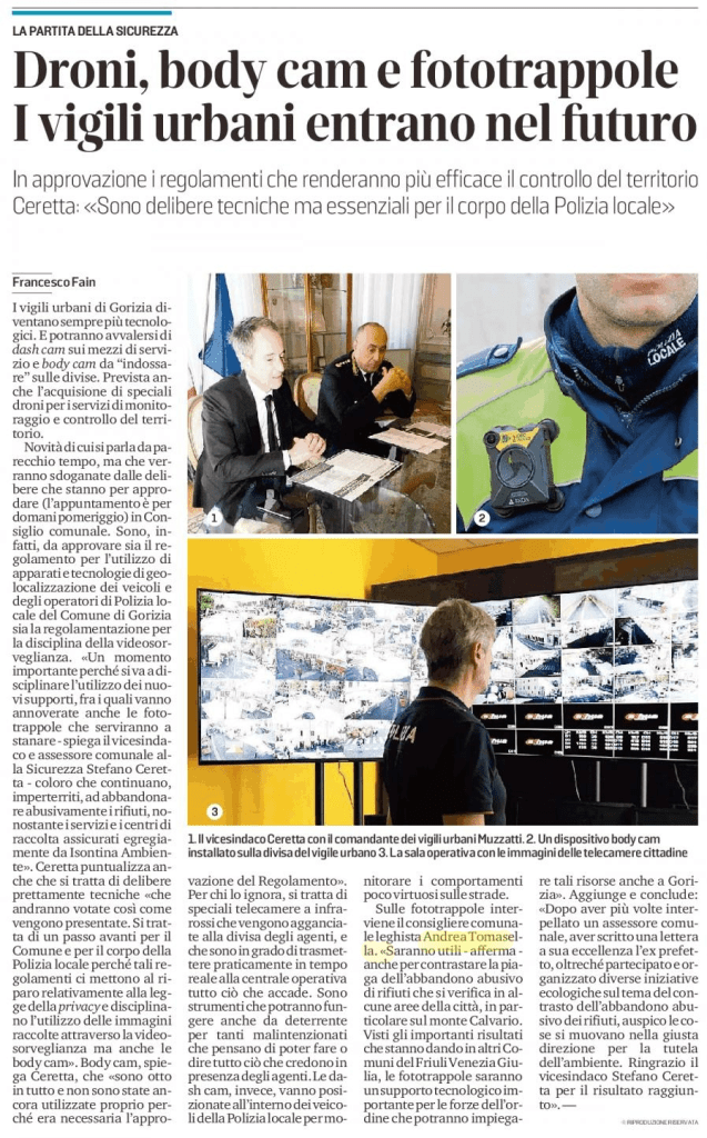 Per tali motivi ritengo molto importante recuperare il tempo perso, anche perché, essendo regolamentato, ora sul nostro territorio comunale è possibile l’utilizzo di strumenti innovativi per garantire maggiore ordine pubblico e quindi anche sicurezza, vivibilità e fruibilità degli spazi pubblici. In particolare, il Comune di Gorizia potrà finalmente impiegare tecnologie come i GPS per la localizzazione delle volanti del Corpo della Polizia Locale, body cam, dash cam e droni. Inoltre, anche le fototrappole potranno essere impiegate e auspico serviranno a contrastare e prevenire l’abbandono abusivo di rifiuti in alcune zone della città, fra cui il monte Calvario.