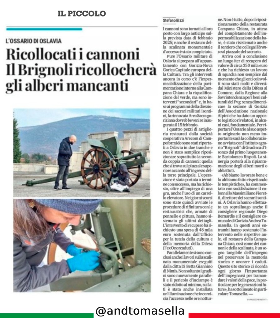 Sono stati ricollocati i cannoni restaurati, un risultato che personalmente apprezzo moltissimo. Inoltre, proseguono ulteriori interventi significativi nel sito della memoria, anche per garantire un avvicinamento più agevole alla Campana Chiara.