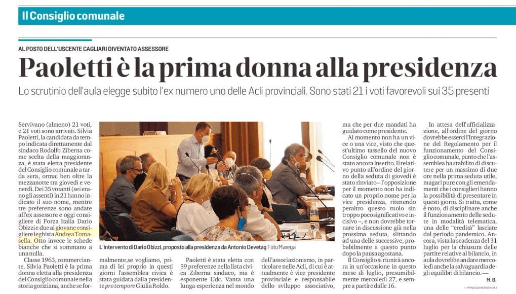 Sicuramente importante è stata anche l’elezione del nuovo presidente del Consiglio comunale che è risultata essere Silvia Paoletti, ovvero esponente della lista civica del sindaco Rodolfo Ziberna.