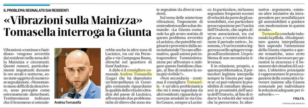 In zona Mainizza, i residenti segnalano la presenza costante di un rumore che si fa particolarmente fastidioso nelle ore serali e notturne, quando non ci sono altri rumori di fondo. Questa vibrazione a scatti è difficile da descrivere, ma è percepita come estremamente fastidiosa. Inoltre, segnalazioni indicano che questo disturbo si avverte anche in altre zone di Lucinico, inclusa via Persoglia e via Campagna Bassa, ma anche nel quartiere di Sant’Andrea. Vorrei porre le seguenti domande alla Giunta comunale:
